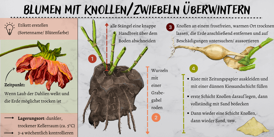 Viele Blumenarten mit Zwiebeln oder Knollen (hier als Beispiel Dahlien) können draußen nicht überwintern und müssen speziell gelagert werden. Wie du das am besten bewerkstelligst, siehst du in der folgenden Grafik: