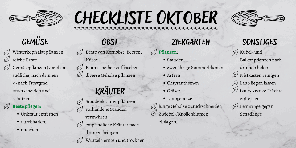 Auch im Obstgarten kann noch geerntet werden, vor allem Äpfel und Birnen (siehe dazu die Grafik aus dem letzten Monat).