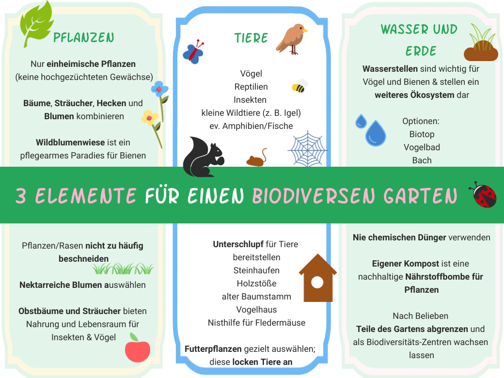 - Bäume, Sträucher, Büsche, Blumen und Gemüsepflanzen miteinander kombinieren. So entstehen verschiedene Mikro- und Makro-Lebensräume für Wildtiere