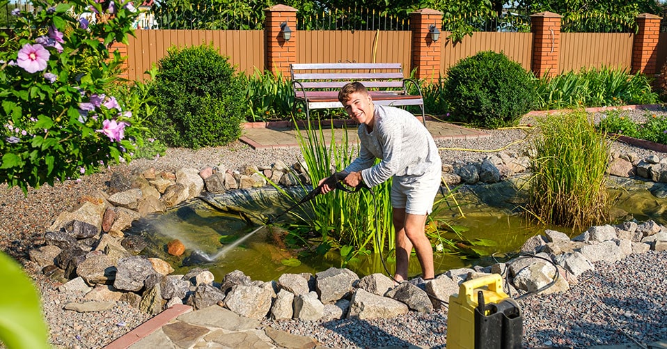 - Man cleans garden pond bottom with highpressure washer from mud and sludge © Freepik/suravikin