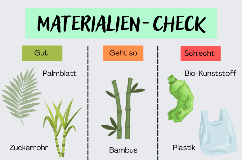 Nachhaltige Alternativen werden zum Beispiel aus Zuckerrohr, Bambus oder Palmblättern hergestellt. Holz oder Bio-Kunststoff wird als umweltbewusst verkauft, verliert aber in puncto Nachhaltigkeit.