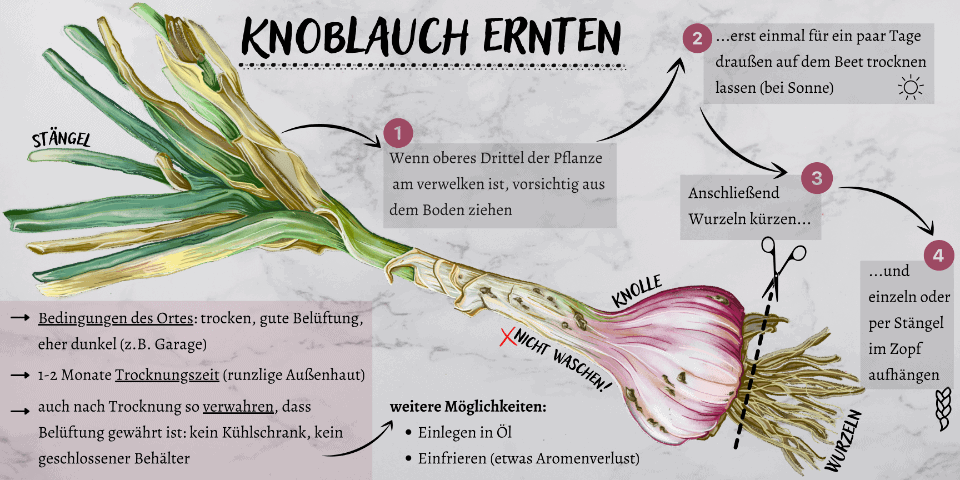 Bei Knoblauch und Zwiebeln sollte allerdings eine spezielle Art des Erntens beachtet werden. Wie du das am besten bewerkstelligst, kannst du der folgenden Grafik entnehmen: