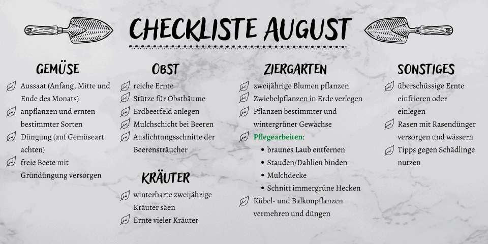 Der Höhepunkt des Jahres ist nun überschritten, der August lässt den Sommer langsam ausklingen. Der Garten blüht jedoch in diesem Monat noch in voller Pracht und lässt dein Gärtner Herz höher schlagen.