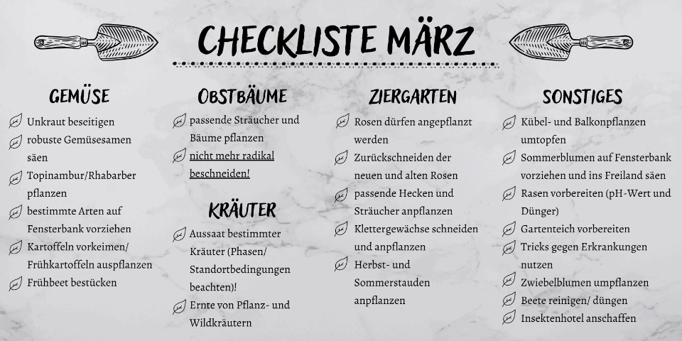 Wenn nicht schon im Februar begonnen, können auch die Kartoffeln vorgekeimt werden (siehe Grafik im Februar).