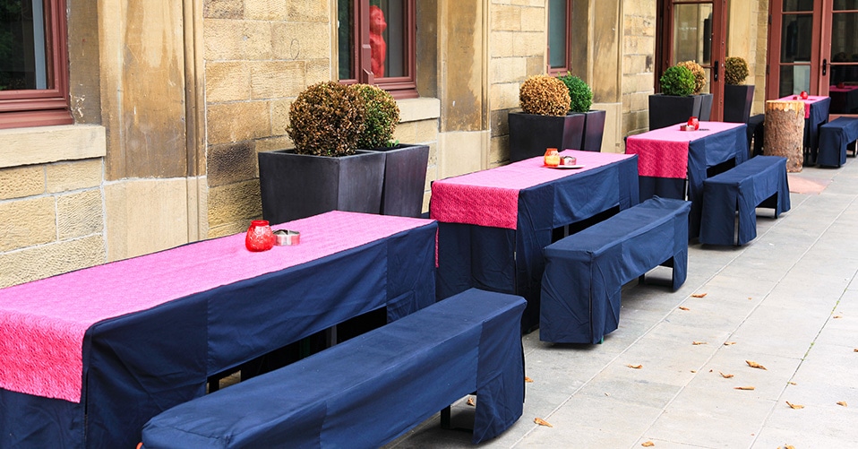 Allerdings sehen diese bei eleganten Festen wie Hochzeiten etwas zu rustikal aus. Um die Bierzeltgarnituren etwas schicker wirken zu lassen, können sie mit speziellen Hussen ausgestattet werden.