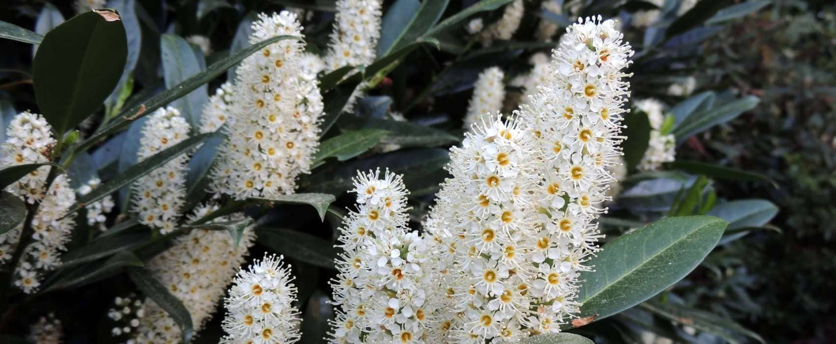 Kirschlorbeer ist eine immergrüne Pflanze, die jedes Jahr im Frühling kleine, weiße Blüten ausbildet. Die Blüten erscheinen vor den Blättern und sind in kleinen Rispen angeordnet.