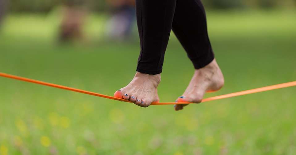 Beim Slacklining werden der Gleichgewichtssinn, die Koordination und die Muskulatur in den Beinen trainiert.