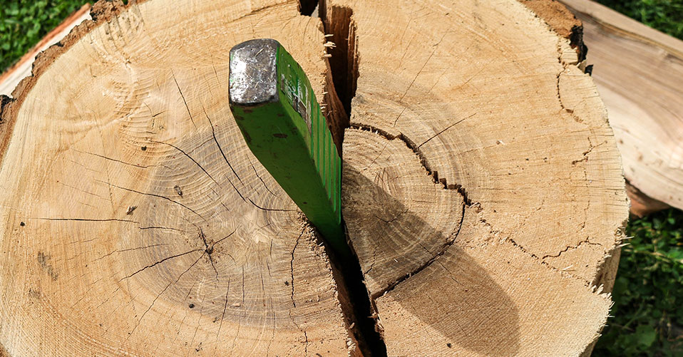 Größere Holzstämme sollten nicht direkt in der Mitte eingeschlagen werden, sondern weiter seitlich. Das erleichtert das Spalten und mindert den Kraftaufwand.