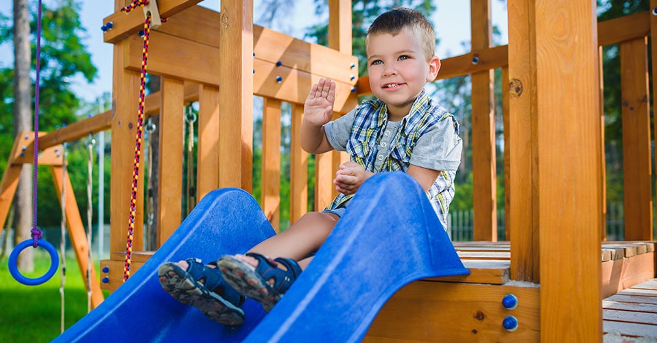 - Spieltürme mit zwei Elementen: Häufig bestehen sie aus einer Rutsche mit Aufstieg. Manchmal besitzt dieser ein überdachtes Podest, auf dem sich die Kinder zusätzlich aufhalten können. Diese Variante spart Platz, ist bei mehreren Kindern jedoch nicht besonders herausfordernd. Für den Anfang sind sie immer empfehlenswert, denn so lässt sich feststellen, ob das Kind überhaupt Interesse daran hat.