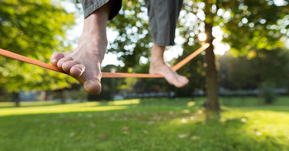 Eine Slackline ist ein beliebtes Outdoor-Turngerät. Dabei handelt es sich um ein breites, elastisches Band, das zwischen zwei Bäumen oder anderen Befestigungsmöglichkeiten gespannt wird, um darauf zu balancieren.