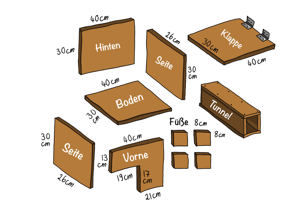 Schneide dein Bauholz in den Formen und Größen zu, wie auf der Abbildung unten aufgezeichnet. Befestige zunächst die Füße und die Scharniere an der Klappe und baue erst anschließend die Hauptkammer und den Tunnel des Igel Hauses auf. Denn das separate Aufbauen macht dir den ganzen Prozess deutlich leichter.